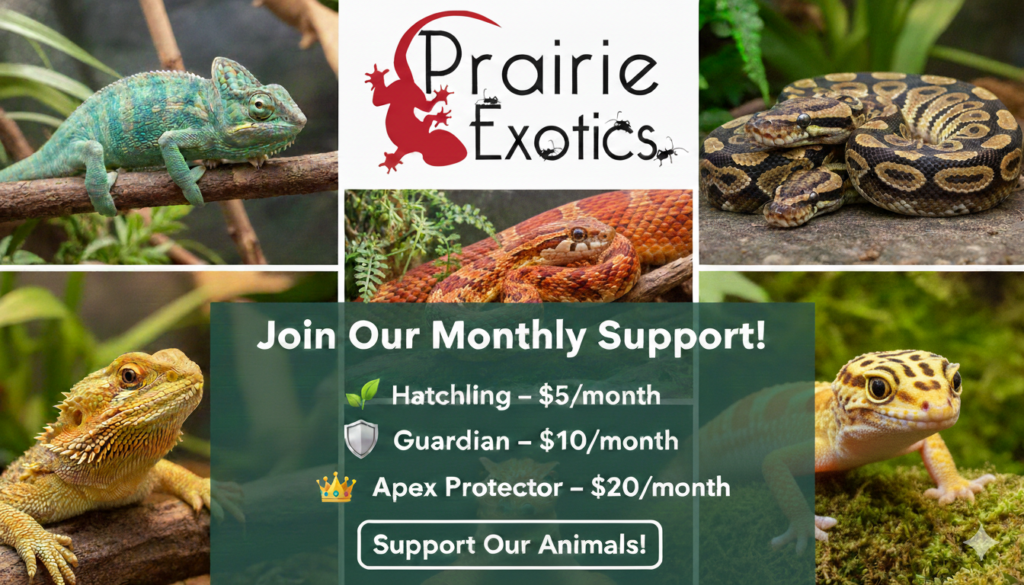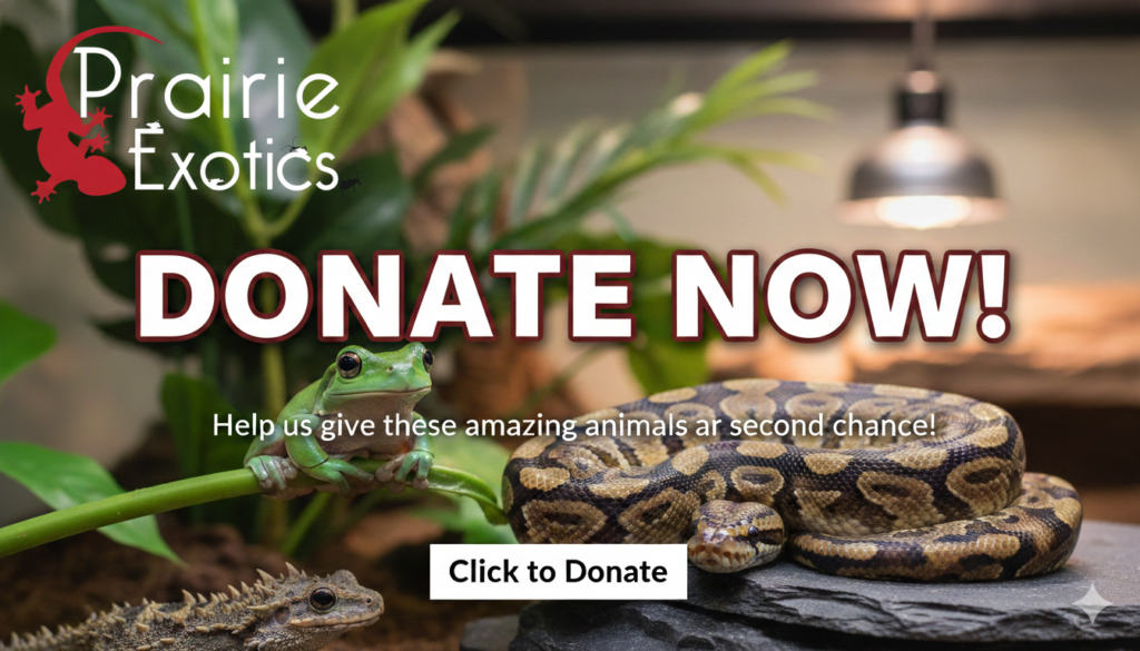 At Prairie Exotics we’re dedicated to providing a safe haven and loving care for exotic reptiles in need. From surrendered pets to rescued wildlife, we give every animal a second chance at a healthy and happy life. Caring for these incredible creatures requires a lot of resources: specialized diets, vet care, habitat maintenance, and so much more. We rely heavily on the generosity of animal lovers like you to continue our vital work.